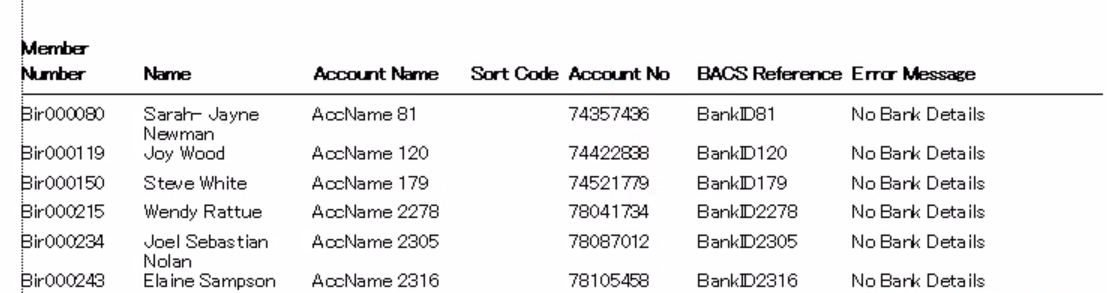 - A report is provided of all missing details, you now have the opportunity to review the bank details on the members record card - see Members - Details